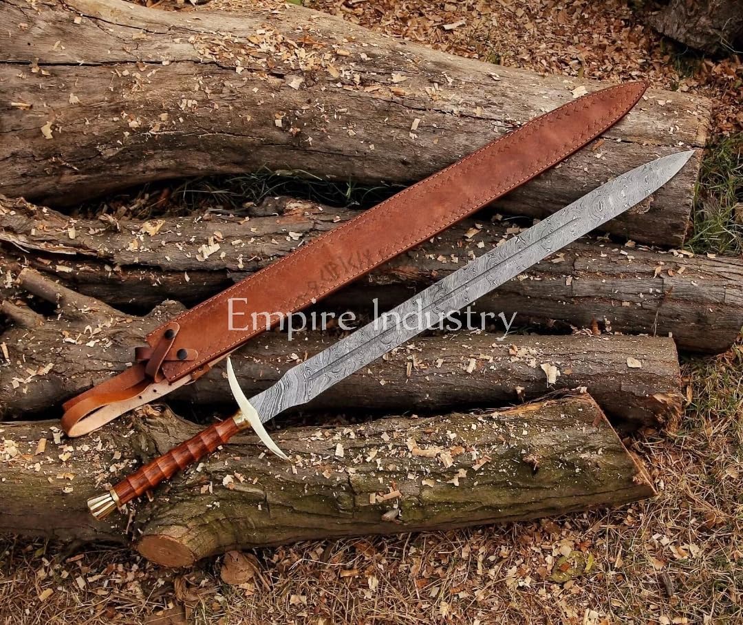 We Also Accept Custom OR Bulk Quantity Orders. Specifications Handmade Damascus Steel Double Edge Viking Sword With Leather Sheath By Empire Industry. HANDLE MATERIAL AWESOME Rose Wood With Brass Guard & Brass Pommel. Overall Length: 34.00 Inches Blade Length: 25.00 Inches Handle Length: 9.00 Inches Blade Thickness: 3 - 4 mm Damascus Steel Blade Having Sharp Edges. Hardness Of The Blade Is 57-60 HRC. SHEATH Well Hand Stitched Cow Hide Leather Sheath QUALITYSTANDARDS Our Damascus blades are made from high quality non-stainless steels which rival or exceed any Damascus blade made from the 10 series with 15N20.Our Damascus combination has taken years to perfect and has been tested under a variety of application which will offer professional performance in categories of toughness, strength (lateral stress) and edge honing and holding ability. And No two blades are exactly same because of its unique pattern. In a 5 spot Rockwell test our blades will average near or close to 58 which offers a perfect balances between its toughness and strength. Our blades due to carbon content need to be regularly treated with wax and/or 3 in 1 oil to maintain its superior quality. Questions If you have any question feel free to send us message we aim to answer all questions within 12 hours. Feedback If you are not satisfied with our service please contact us before leaving any negative or natural feedback. We will resolve all issues as quickly as possible. Disclaimer We are not responsible for any injuries associated with the use of our tools. Our products are intended for legal use only by responsible buyers. Therefore, we will not sell our products to anyone under the age of 18.
