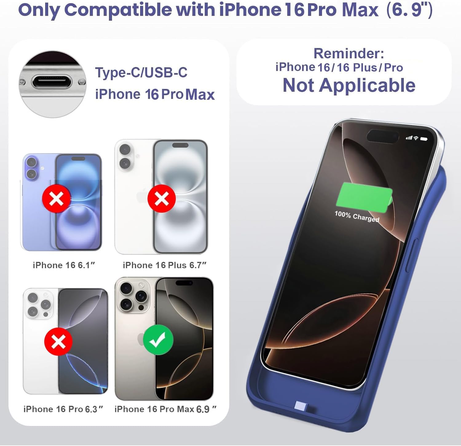 Features:1.This upgraded battery case is only fits for iPhone 16 Pro max (6.9 inch) ,not works on iPhone 15 Pro max /15 Pro/15 Plus/14 Pro Max/13 Pro Max and other models.2.The 4 LED indicator will show you how much power is left (25%-50%-75%-100%).3.ON/OFF button for optional power output control, iPhone 16 Pro max (6.9 inch) battery use Grade A+ batteries with CE and RoHS certification.4.it is 360°protection to corners and sides, protecting your phone from drops and impacts,not protection screen,kindly advice use a glass screen protector at the same time.5.100% compatible with all iOS versions, Apple Pay, and future iOS software updates (Apple Car Play is not supported).6.ONLY works with Apple Airpods or other wireless Bluetooth headphone.