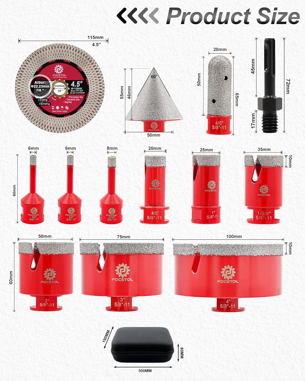 | Included Components | Included components: 8pcs core drill bits (6mm, 8mm, 20mm, 35mm, 50mm, 75mm, 100mm), 1pc 20mm finger milling bit, 1pc 50mm beveling chamfer bit, 1pc SDS adapter, 1pc 115mm tile saw blade. |