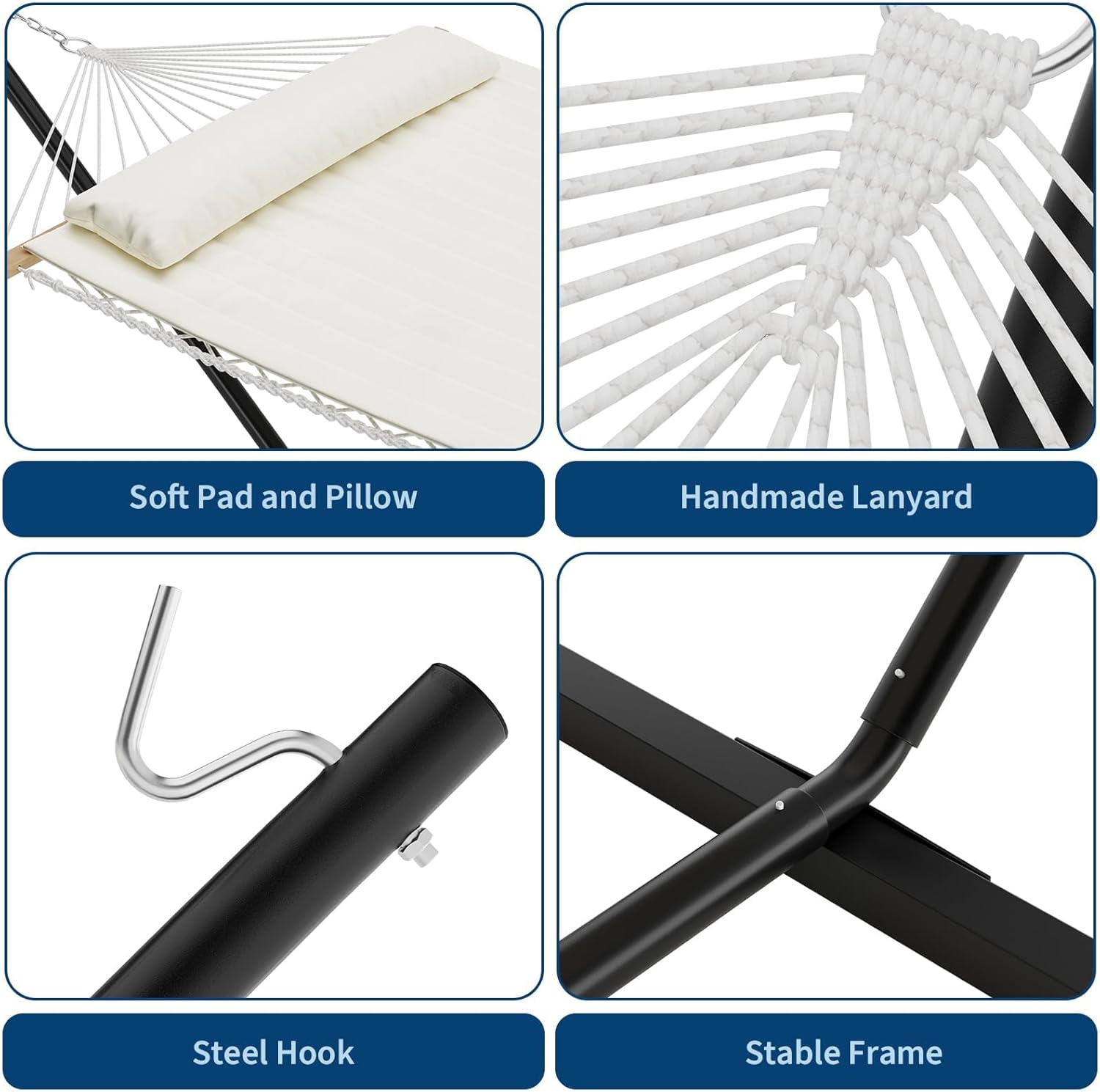 Experience ultimate relaxation with our Hammock With Stand, designed to comfortably accommodate two people. This double hammock with stand features a reversible quilted pad for added comfort and versatility, making it perfect for outdoor use, camping trips, patios, or beach days. Crafted with durable hardwood spreader bars, this freestanding hammock ensures stability and long-lasting support.The portable design allows you to easily set up and move the hammock wherever you desire, whether it's in your backyard, at a campsite, or by the shore. The rope hammock with stand construction combines classic style with modern convenience, providing a cozy spot for you and a loved one to unwind.Features:- Spacious 2 person hammock with stand, perfect for couples or friends- Reversible quilted pad adds extra comfort and style- Durable hardwood spreader bars for enhanced stability- Freestanding design allows for easy setup without the need for trees- Portable and lightweight, ideal for camping, patio, beach, and outdoor use- Sturdy rope hammock construction for a classic look and reliable supportEnjoy the perfect blend of comfort, style, and convenience with this two person hammock with stand. Whether you're looking to relax outdoors, enjoy a camping adventure, or add a cozy touch to your patio, this hammock is the ideal choice. Order now and elevate your outdoor relaxation experience!