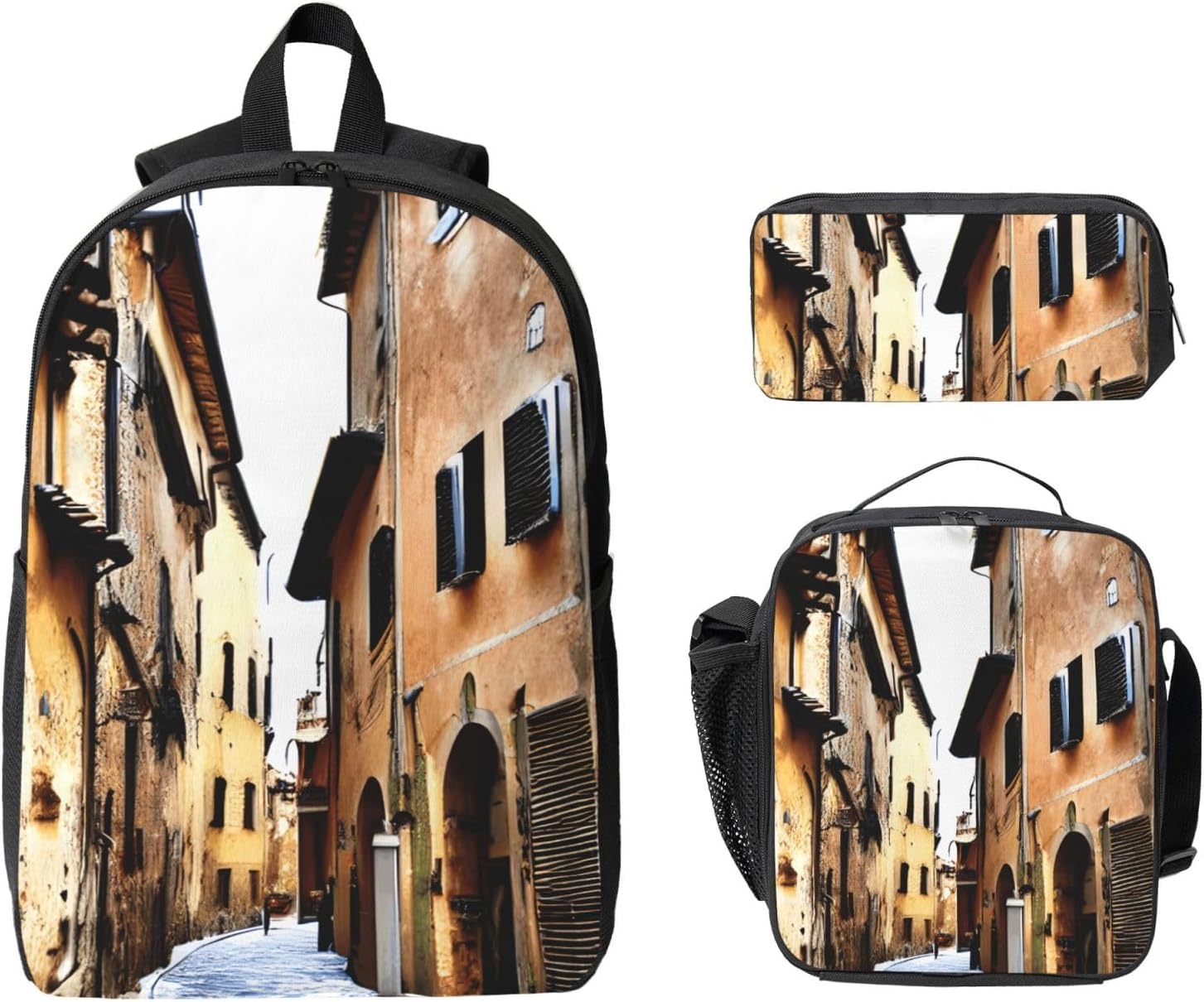 Offering a functional combination of a durable backpack, insulated lunch bag, and pencil case, this set made of Oxford fabric is designed to stand up to daily challenges. The Italy Tuscan print backpack provides ample space, while the smooth zippers and sturdy stitching make it a reliable companion. The lunch bag keeps your meals fresh, and the pencil case ensures your stationery remains organized. Ideal for a variety of outdoor activities, this set is both practical and versatile, making it the perfect choice for anyone looking for an easy to carry and dependable accessory set.