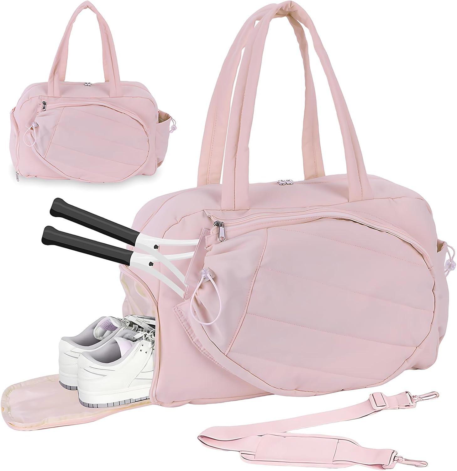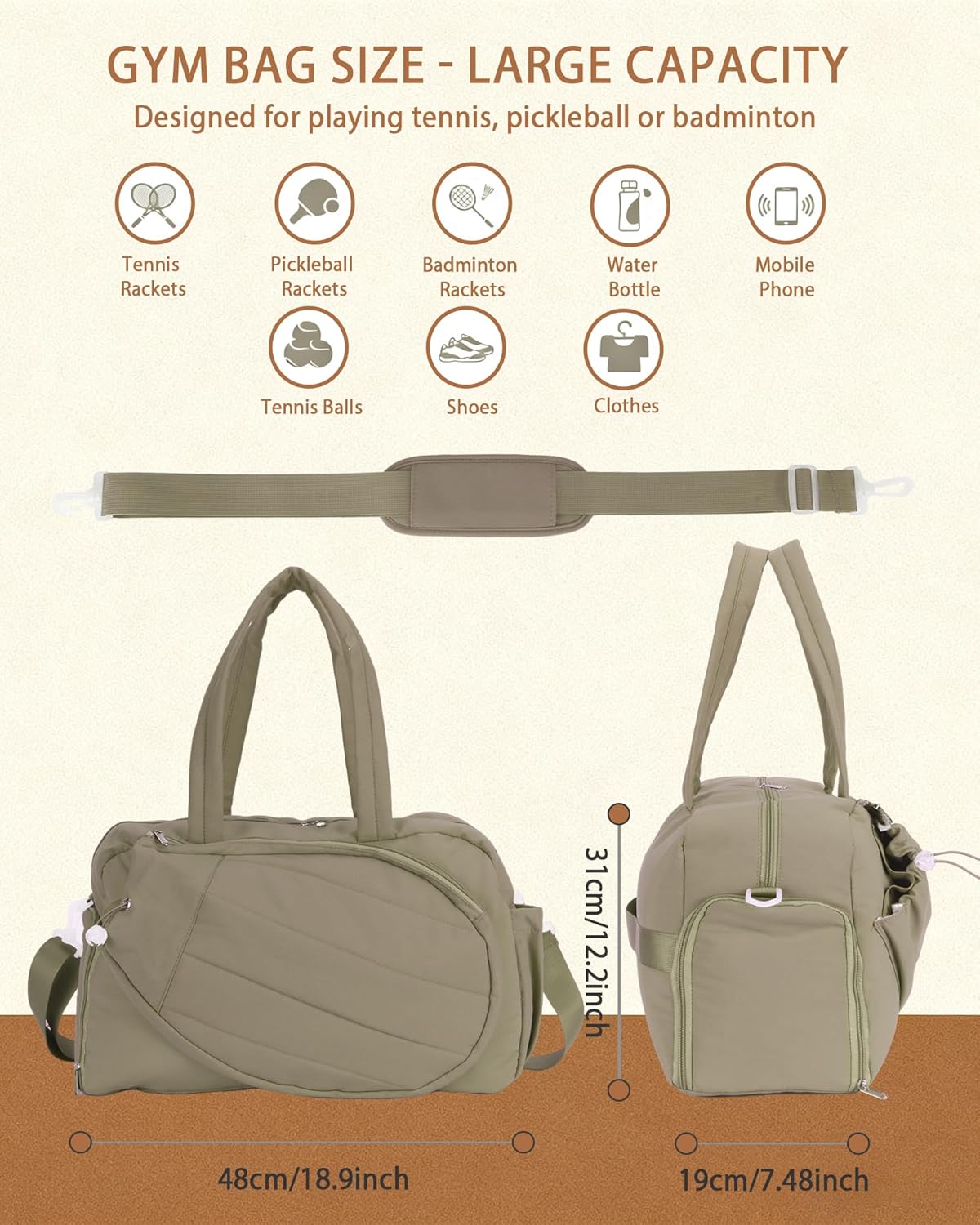 "Women's Quilted Tennis Gym BagKey Specs & Core FeaturesBasic Parameters: 18.9 x 7.5 x 12.2 inches | 35L Capacity | 1.48 lbs (673g)1. Professional Gear Protection- Dedicated padded compartment: Safely holds 2 tennis rackets or 4 pickleball paddles, paired with UV-protective lining to avoid gear damage2. Smart Storage Solutions- Ventilated shoe compartment (fits US size 10) & waterproof wet pocket: Separates dirty shoes and damp items from clean belongings- Spacious main compartment: Fits 15.6"" laptop, workout clothes, toiletries & travel essentials, meeting multi-scene needs3. Durable & Reliable Design- Quilted water-resistant fabric: Shields gear from light rain and spills; shock-absorbing details protect valuables4. 3 Flexible Carrying Ways- Crossbody Sling: Attach the adjustable strap for hands-free convenience, perfect for rushing to tennis practice or running post-gym errands- Shoulder Carry: Use the padded shoulder strap for balanced weight distribution, ideal for commuting with your laptop or gym gear- Hand Carry: Grab the sturdy top handles for a chic tote look, great for brunch dates or short weekend trips5. Multi-Scene Versatility- Acts as tennis bag, gym bag & duffle bag, seamlessly adapting to life, work and sports scenarios"