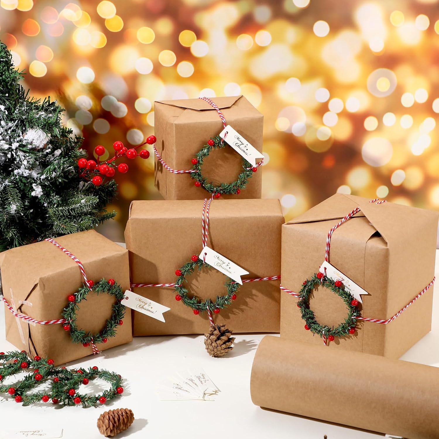Features: Generous Size for Large Gifts: With a generous size of 15.7 inches x 65.6 feet, our wrapping paper is ample for wrapping even the most substantial presents, ensuring your gifts are beautifully adorned from every angle. Long-Lasting Ribbons & Tape: The included 98.43 feet/30 meters of ribbon and double-sided tape offer ample length to secure and embellish your packages with ease, ensuring a secure and stylish finish. Specifications: Material: mainly paper Color: mainly brown Size: Wrapping paper: about 15.7 x 65.6 inches Snowberry branch: diameter about 3.15 inches Cotton rope: about 30 meters Package includes: 1 X Rolled Gift Paper 20 x Snowberry branch 50 x Tape 1 x Cotton rope Notes: Manual measurement, please allow slight errors on size. The color may exist a slight difference due to different screen displays.
