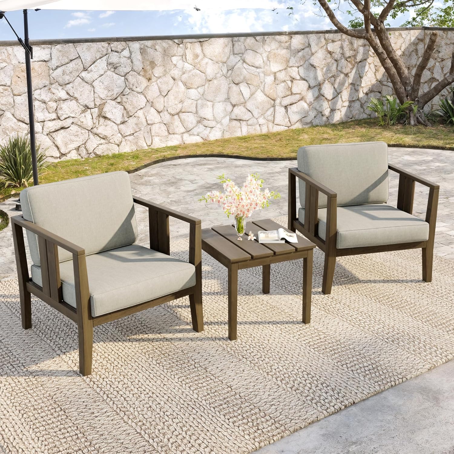 Feturures1. The frame is crafted from premium teak, a material naturally resistant to moisture, outdoor wear and tear, and temperature fluctuations. Its dense texture and rich grain provide a reliable foundationfor year-round use while maintaining exceptional aesthetic appeal.2. Cushions are filled with foam sponge and synthetic fibres, offering stable support and long-lasting shape retention.3. The inner padding is encased in outdoor-grade, splash-resistant fabric, effectively preventing moisture penetration.4. The accompanying side table features a matching teak frame, ensuring structural unity and longevity throughout the ensemble.From the framework to the cushion construction, the synergistic materials of this complete set guarantee stable, dependable performance in any outdoor environment.