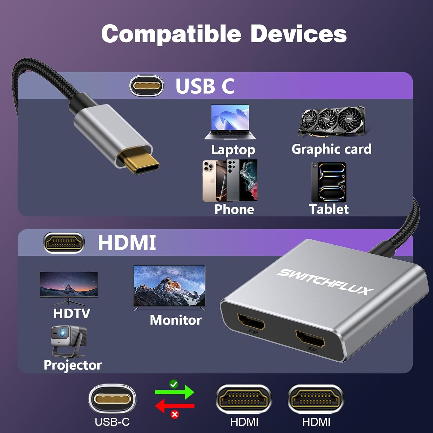 USB C to HDMI Adapter: The usb c to dual HDMI splitter extends the resolution of your computer monitor up to 4K @60Hz, and the dual-monitor USB C adapter also supports 1440p and 1080p 60Hz provided by HDMI MST technology; use this high-performance USB-C adapter to provide a high-definition display to immerse yourself in both gaming and movie watching. Connectors: USB C Gold-plated Male (Input) HDMI Gold-plated Female (Output) Specification: Shape: Compact,lightweight,easy to carry Installation : Plug and Play,No driver or software installation required Gold-plated connectors : Optimize its performance,resist corrosion Ultra HD : Supports resolution up to 4K@60Hz Package Contents: 1×Type C to Dual HDMI Adapter Note: 1.This is NOT a bi-directional 2.Make sure that your devices support 4K@60Hz resolution, otherwise 4K@30Hz, 2K@144Hz, 1080P screen display may appear 3.Before use, please modulate the display to the HDMI port to receive the signal