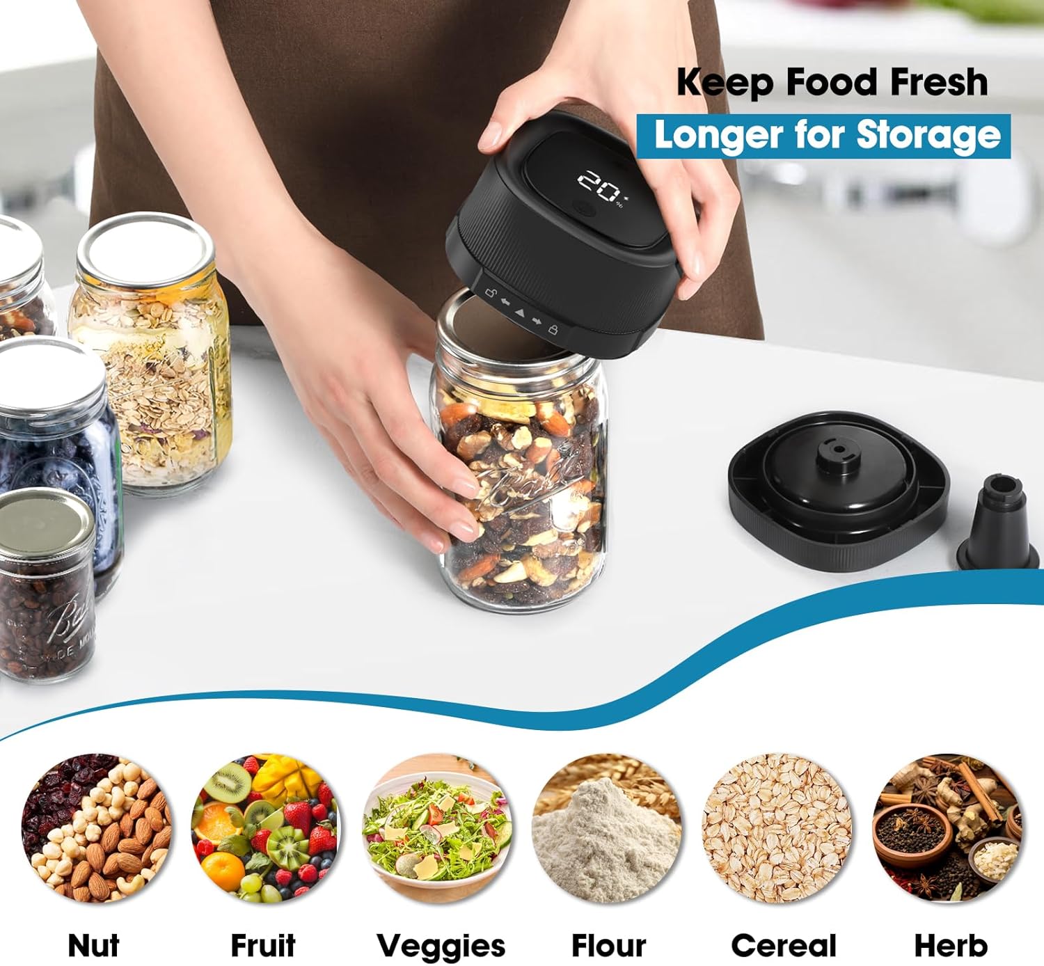 | Included Components | Mason jar vacuum sealer*1, regular mouth lids*5, suction nozzle*1, vacuum bag*1, wide mouth lids*5 |